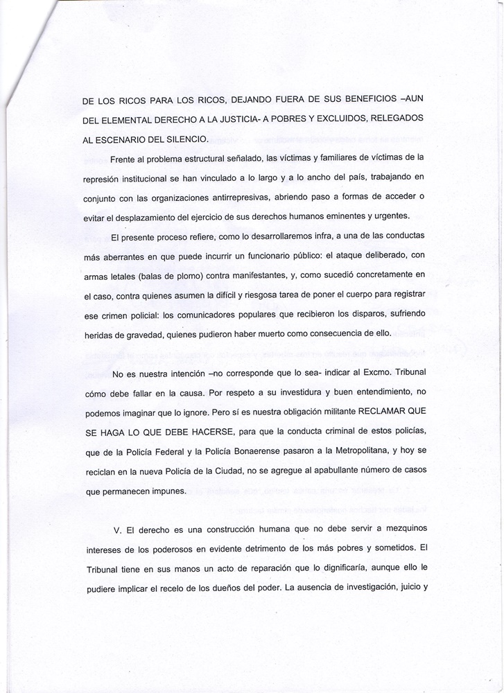 Los días 10, 12, 15, 19 y 24 de Mayo de 2017 llevamos a juicio oral y público a la Policía Metropolitana (hoy Policía de la Ciudad) que disparó balas de plomo contra los comunicadores de la RNMA en el violento desalojo del acampe de la Sala Alberdi en Marzo de 2013. El miércoles 31 de Mayo será la Sentencia.