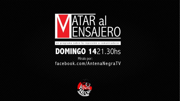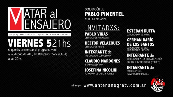 Continúa la campaña para instalar en la agenda y dar a conocer el juicio donde se sienta por primera vez a la policía de Macri en el banquillo. Hoy, en vísperas de la continuación del juicio en el día de mañana, desde las 21.30hs Antena Negra TV transmitirá «Matar al Mensajero», un programa especial dedicado a los diferentes tipos de ataques a la prensa, que fue grabado el viernes 5 de mayo en el auditorio de ATE Nacional, en el marco del Juicio a la Policía de Macri.