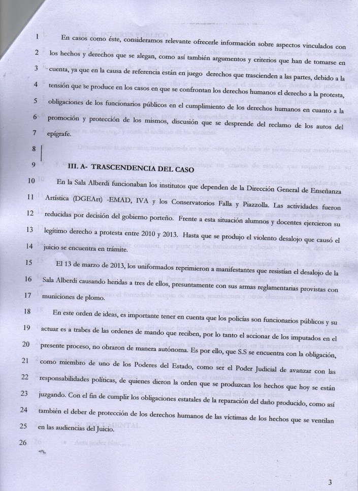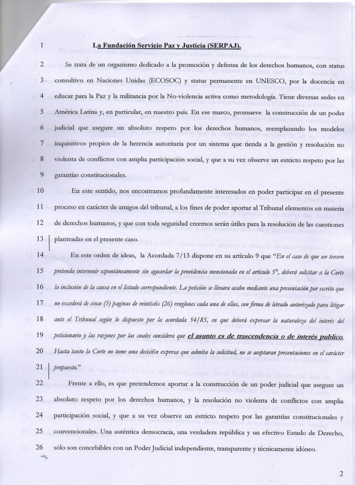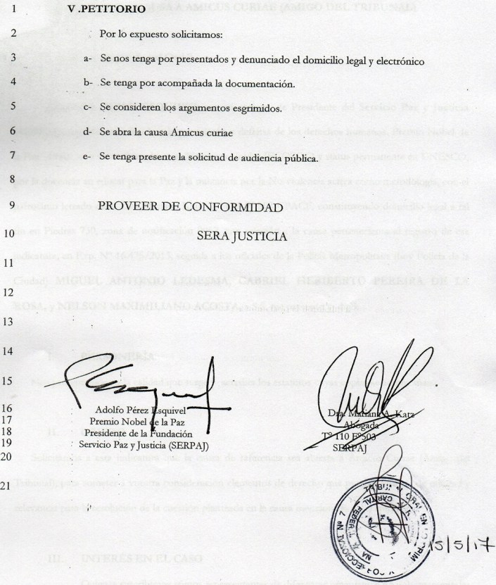 El pasado lunes 16 el Presidente del Servicio Paz y Justicia (SERPAJ) y premio Nóbel de la Paz Adolfo Pérez Esquivel se sumó como amicus curiae a la causa acompañando a la querella que constituyeron Esteban Ruffa y Germán de los Santos, comunicadores de la Red Nacional de Medios Alternativos (RNMA) baleados con plomo en marzo de 2013 por la Policía Mertropolitana. Los amicus curiae son presentaciones voluntarias formales de terceros ajenos a una causa judicial para brindar su punto de vista a un tribunal para ayudar en la resolusión del caso. De ésta manera, Pérez Esquivel se suma a otras renombradas figuras que se presentaron como amicus curiae, como Nora Cortiñas de Madres de Plaza de Mayo-Línea Fundadora, Pablo Pimentel de la Asamblea Permanente por los Derechos Humanos-La Matanza, entre otras personalidades. Esto va en línea también con la asignación de un veedor por parte de la Asociación Abuelas de Plaza de Mayo para presenciar todas las audiencias.