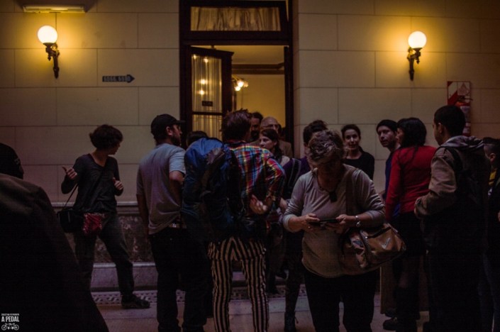 El cuarto día del juicio a la policía de Macri por disparar plomo contra dos comunicadores en 2013 fue corto. Por cuestiones administrativas del tribunal y la fiscalía sólo presentaron testimonio los oficiales Luis Eduardo Isla y Javier Esteban Morel, los dos testigos policiales que no habían concurrido la audiencia anterior, pero cuyas declaraciones fueron solicitadas por el fiscal Oscar Ciruzzi por considerarlas “clave”. El viernes 19 declararán los peritos de la Gendarmería Nacional que hicieron la pericias balísticas y las planimetrías con los movimientos de los policías metropolitanos aquella noche, que determinaron que estén sentados en el banquillo los policías Pereira de la Rosa, Ledesma y Acosta. El miércoles 24 presentarán sus alegatos la querella y la fiscalía, y por la tarde la defensa policial, por lo cual se espera que el tribunal fije la fecha de la sentencia. Imágenes: Colectiva Fotografía a Pedal y Juan Cicale.