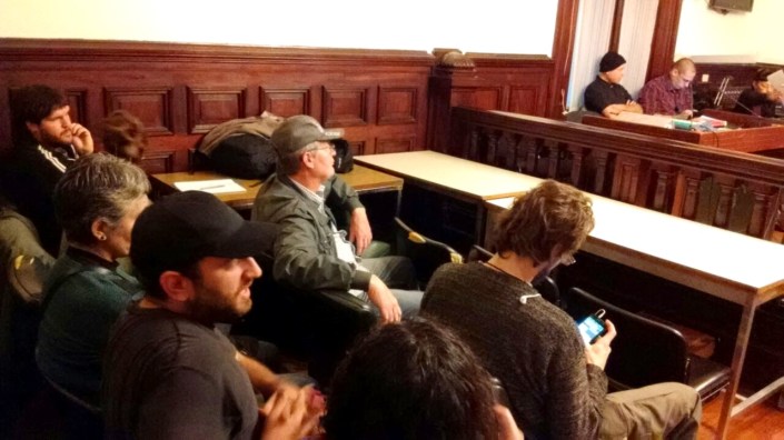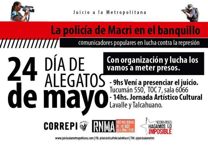 En la quinta audiencia del Juicio a la Policía de Macri prestaron declaración los peritos de la Gendarmería Nacional Argentina que realizaron la pericia balística sobre los fragmentos de plomo policiales con los que fueron heridos Esteban Ruffa y Germán de los Santos – ambos comunicadores de la Red Nacional de Medios Alternativos (RNMA) – y un manifestante en el violento desalojo de la Sala Alberdi la noche del 13 de marzo de 2013. También declararon los gendarmes peritos que confeccionaron la planimetría que muestra el movimiento de las células de la Policía Metropolitanaaquella noche. En ambos casos los expertos en materia pericial aportaron muy pocas precisiones, detalles y explicaciones que pudieran echar más claridad sobre lo que se está juzgando. El miércoles 24, desde las 9.30, presentarán sus alegatos la querella y la fiscalía, y por la tarde la defensa de Gabriel Pereira de la Rosa, Nelson Acosta y Miguel Ledesma, los tres policías imputados. Desde las 15 se realizará en la calle una radio abierta e intervenciones artísticas en Talcahuano y Lavalle, en las inmediaciones del Palacio de Tribunales. Se espera que ese día también el tribunal fije la fecha de la sentencia.