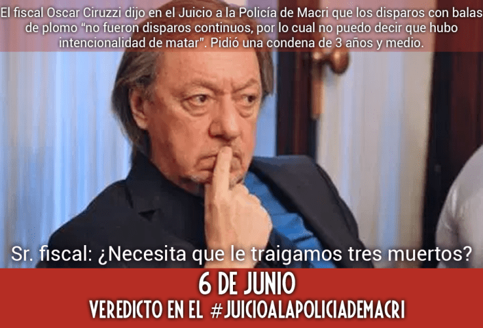 También cabe mencionar al fiscal general Oscar Ciruzzi, otro cómplice de la represión que solicitó sólo la pena de tres años y tres meses para los policías imputados por «abuso de armas y lesiones». El fiscal que necesitaba muertos.